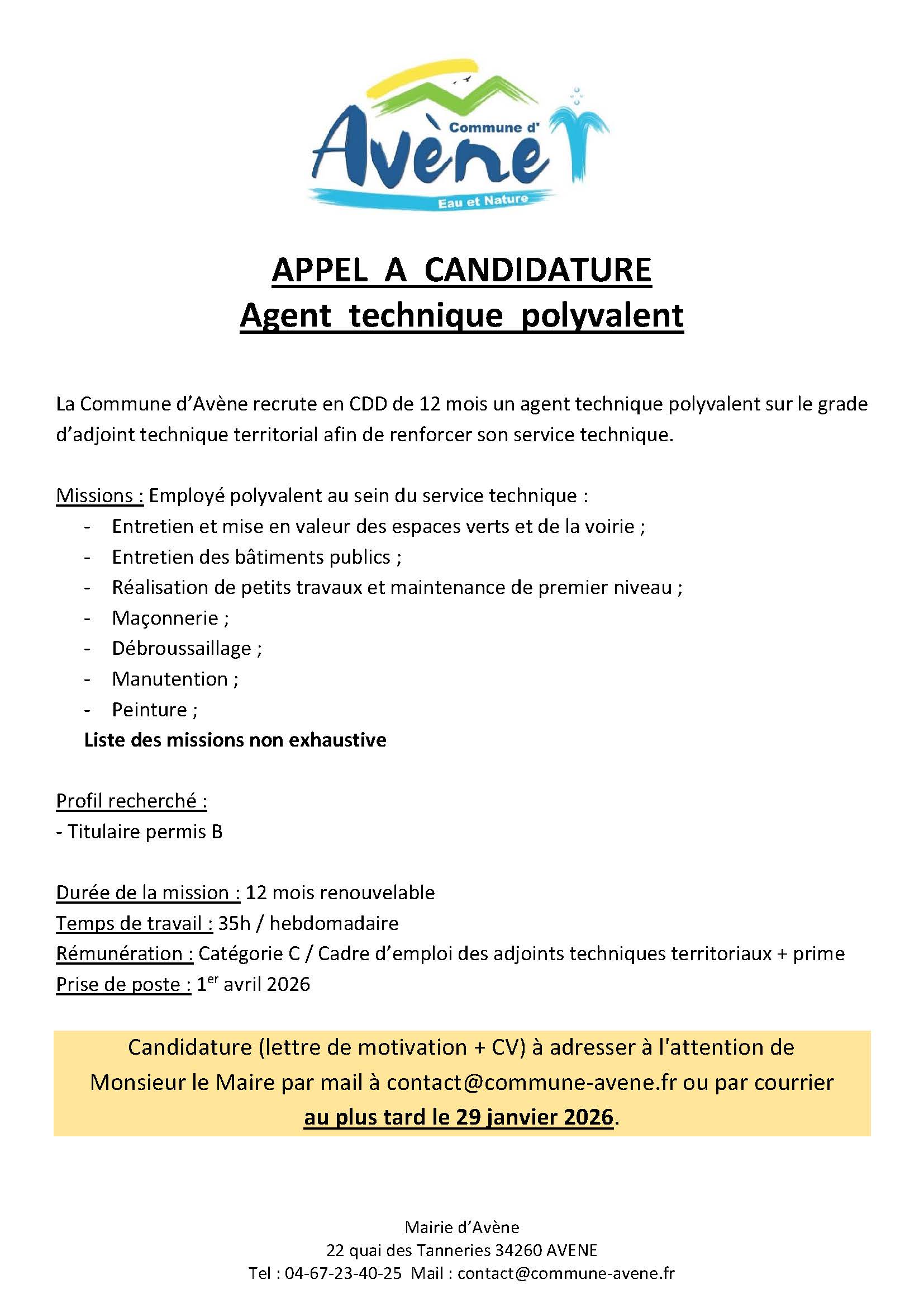 La Commune d’Avène recrute en CDD de 12 mois un agent technique polyvalent sur le grade d’adjoint technique territorial afin de renforcer son service technique.